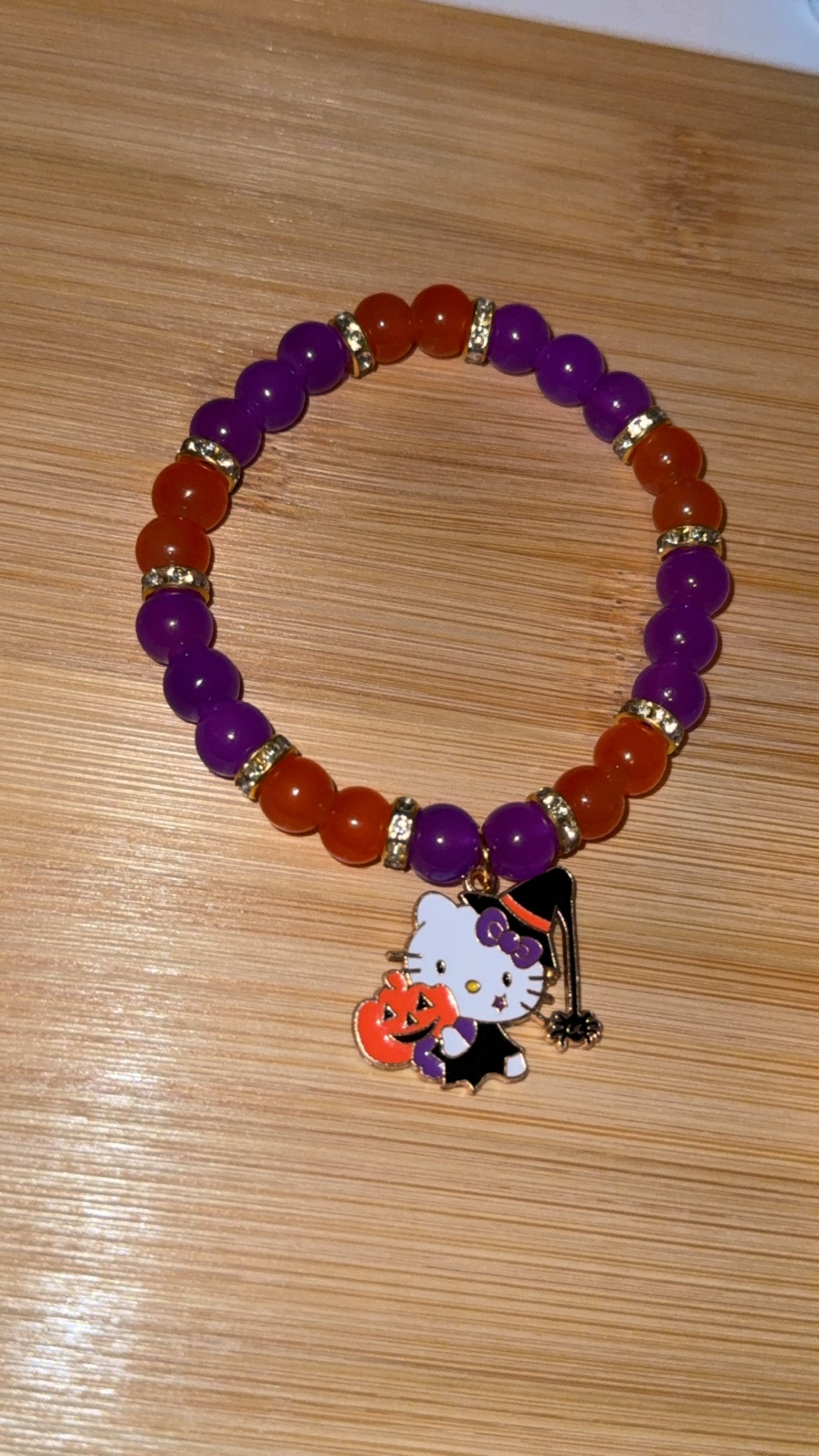 Add a touch of Halloween magic to your outfit with this adorable Spooky Cutie Bracelet! Featuring glossy orange and purple beads accented with sparkling gold spacers, it's the perfect mix of festive and fashionable. The charm brings extra Halloween cheer with its sweet design - perfect for spooky season lovers who still like to keep things cute.